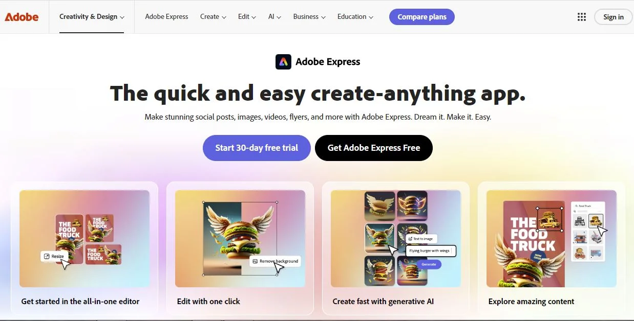 یکی از بهترین راهها برای طراحی بنر سایت با هوش مصنوعی و رایگان، Adobe Creative Cloud Express است. این نرم افزار دارای طیف گسترده ای از قالب ها و عناصر طراحی است که تنها با چند کلیک می توانید از آنها برای ایجاد بنرهای خیره کننده استفاده کنید.
